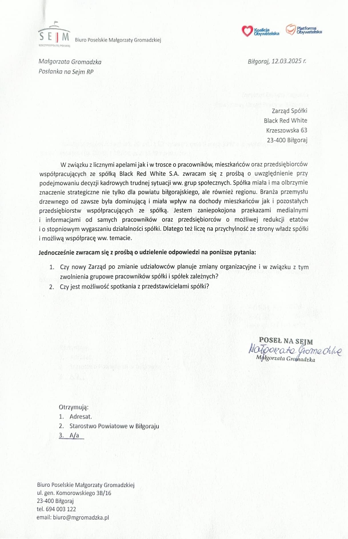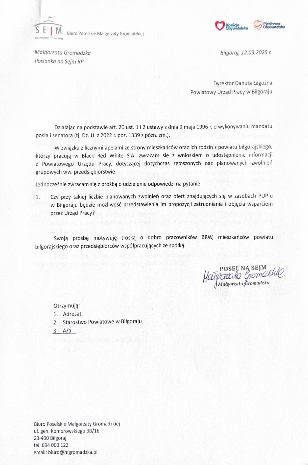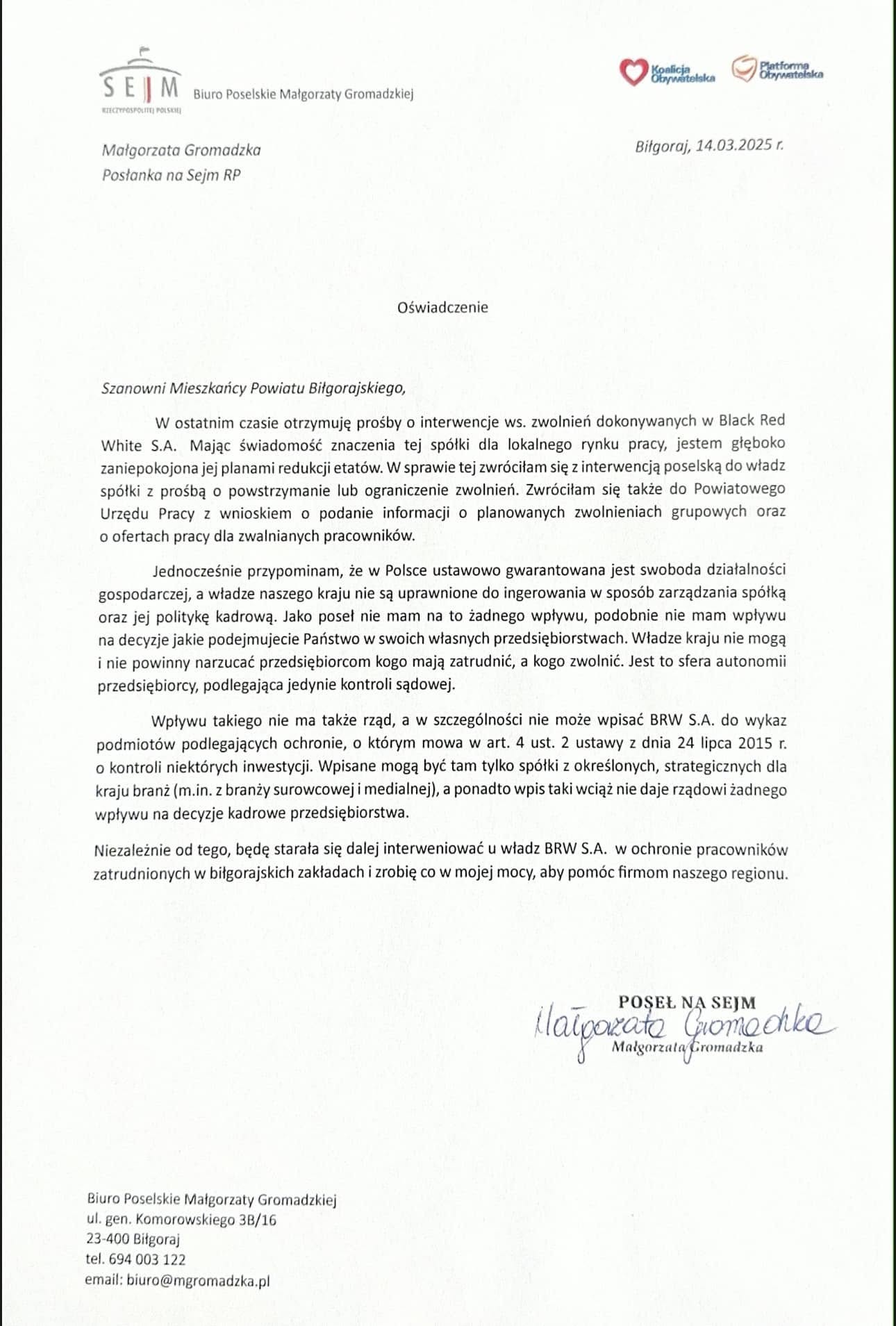 W sieci opublikowała także swoje oświadczenia oraz pisma do BRW i Powiatowego Urzędu Pracy w Biłgoraju.