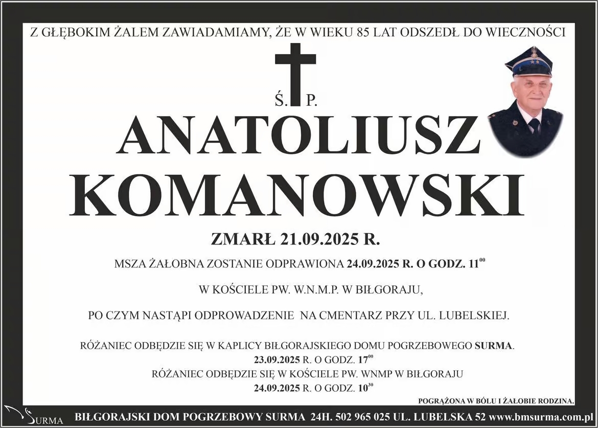 Msza święta pogrzebowa sprawowana będzie, we środę 24 września 2025 roku, o godzinie 11:00, w kościele Wniebowzięcia NMP w Biłgoraju.