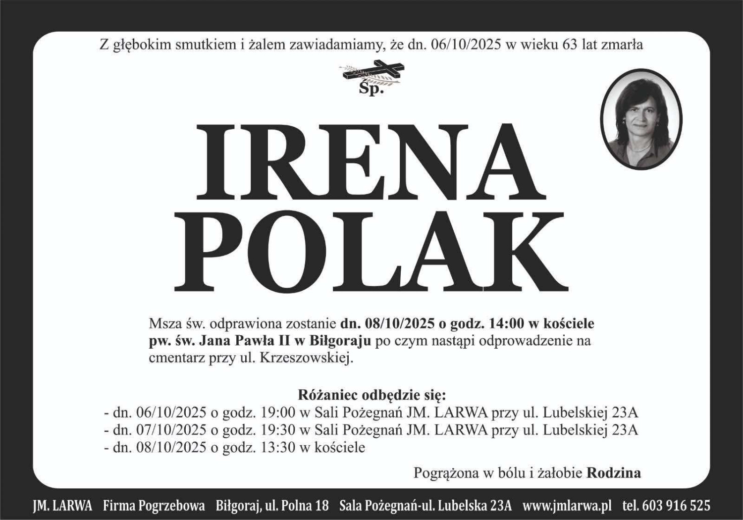 Irena Polak zmarła 6 października 2025 roku, w wieku 63 lat. Pogrzeb odbędzie się 8 października 2025 roku, w kościele pw. św. Jana Pawła II. Początek uroczystości o godzinie 14:00.