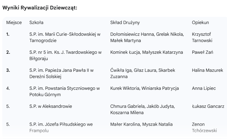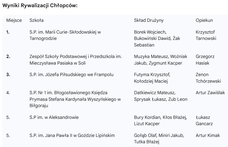Zawody okazały się wielkim sukcesem dla gospodarzy. Uczniowie Szkoły Podstawowej im. Marii Curie-Skłodowskiej w Tarnogrodzie wywalczyli złote medale zarówno w kategorii dziewcząt, jak i chłopców, potwierdzając swoją dominację w tej dyscyplinie.