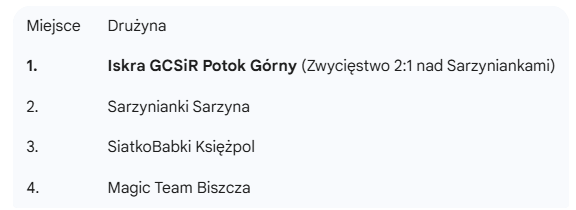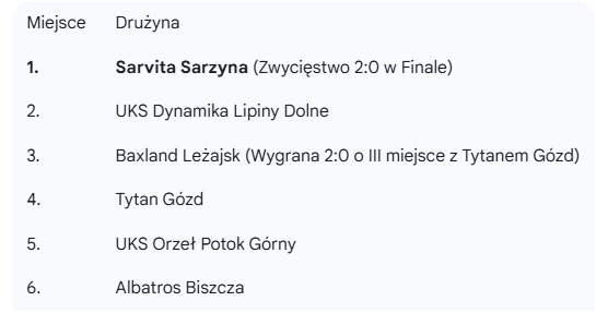 W wielkim finale zmierzyły się drużyny UKS Dynamika Lipiny Dolne oraz Sarvita Sarzyna. Po emocjonującej walce, zwycięstwo i Puchar Wójta Gminy Potok Górny, zdobyła ekipa:
