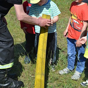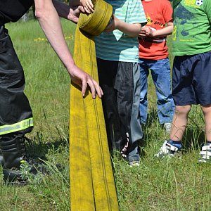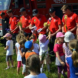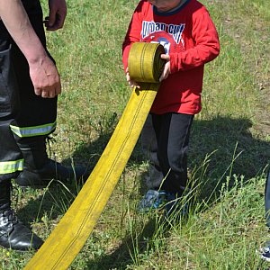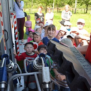 Dzieci mogły również zapoznać się ze sprzętem jakim dysponują strażacy jak również założyć strażacki hełm czy też ubranie strażackie. Natomiast największą atrakcją dla dzieci było lanie wody z węży strażackich oraz ustawienie kurtyny wodnej.