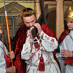 Misterium składało się z czterech części, Ostatniej Wieczerzy i przedstawienia ustanowienia Eucharystii oraz modlitwy w Ogrójcu, sądu Piłata, biczowania i skazania na śmierć, Drogi Krzyżowej oraz śmierci na krzyżu Jezusa Chrystusa. Nie tak dawno śpiewaliśmy "cicho, cicho kroku zwolnijcie, bo miniecie stajnię ubogą...", dziś także wołamy o ciszę, bo tylko w ciszy usłyszeć można oddech Jezusa słuchającego słów wyroku upadającego na twarde kamienie, przybijanego do krzyża i wypowiadającego ostatnie słowa - przypomnieli artyści podczas Misterium.