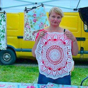 Wśród wystawców jest twórczyni ludowa, Joanna Falkowska - Frącek. -Wszystko co prezentuje, wykonane jest własnoręcznie przeze mnie. To rzeczy unikatowe. Obok materiałów naturalnych i własnej pracy wkładam w każdą rzecz odrobinę serca i duszy oraz zapału. Są to szydełkowane serwety i obrusy. Zajmuje się także tkactwem, ma także torby wykonane na prawdziwych starych krosnach. Moja ideą jest połączenie twórczości ludowej z teraźniejszością, by była w tym nuta tradycji ale by także odpowiadało gustom współczesnych ludzi - przyznaje.