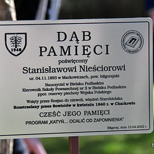 Dziś polskich oficerów, funkcjonariuszy policji państwowej, Korpus Ochrony Pogranicza i funkcjonariuszy uczczono na dziedzińcu Zespołu Szkół Budowlanych i Ogólnokształcących w Biłgoraju. Placówka przygotowała uroczysty apel i część artystyczną. W ramach projektu edukacyjnego "Katyń... ocalić od zapomnienia" posadzono także dąb pamięci. Celem programu jest uczczenie pamięci Bohaterów - ofiar Zbrodni Katyńskiej, a zarazem przybliżenie ich sylwetek poprzez posadzenie 21 857 dębów pamięci. Każdy dąb upamiętnia konkretna osobę, która zginęła w Katyniu, Charkowie, Bykowni lub Twerze. Dąb pamięci na placu "Budowlanki" poświęcony został jednemu z jeńców katyńskich, który pochodził z powiatu biłgorajskiego.