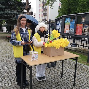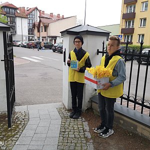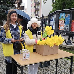 Wolontariusze Szkoły Podstawowej nr 5 wraz z opiekunami i rodzicami wręczali mieszkańcom Biłgoraja i gościom papierowe żonkile, które były wyrazem wdzięczności dla osób wspierających swym datkiem pacjentów Hospicjum Santa Galla w Łabuńkach.