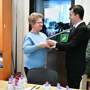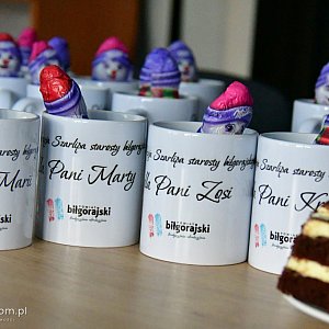 Na spotkaniu z paniami podarował drobne upominki w postaci kubków personalizowanych oraz czekoladową figurkę. Zadbał także o słodki poczęstunek. Uczestniczki zajęć Klubu Seniora przygotowały poczęstunek.
