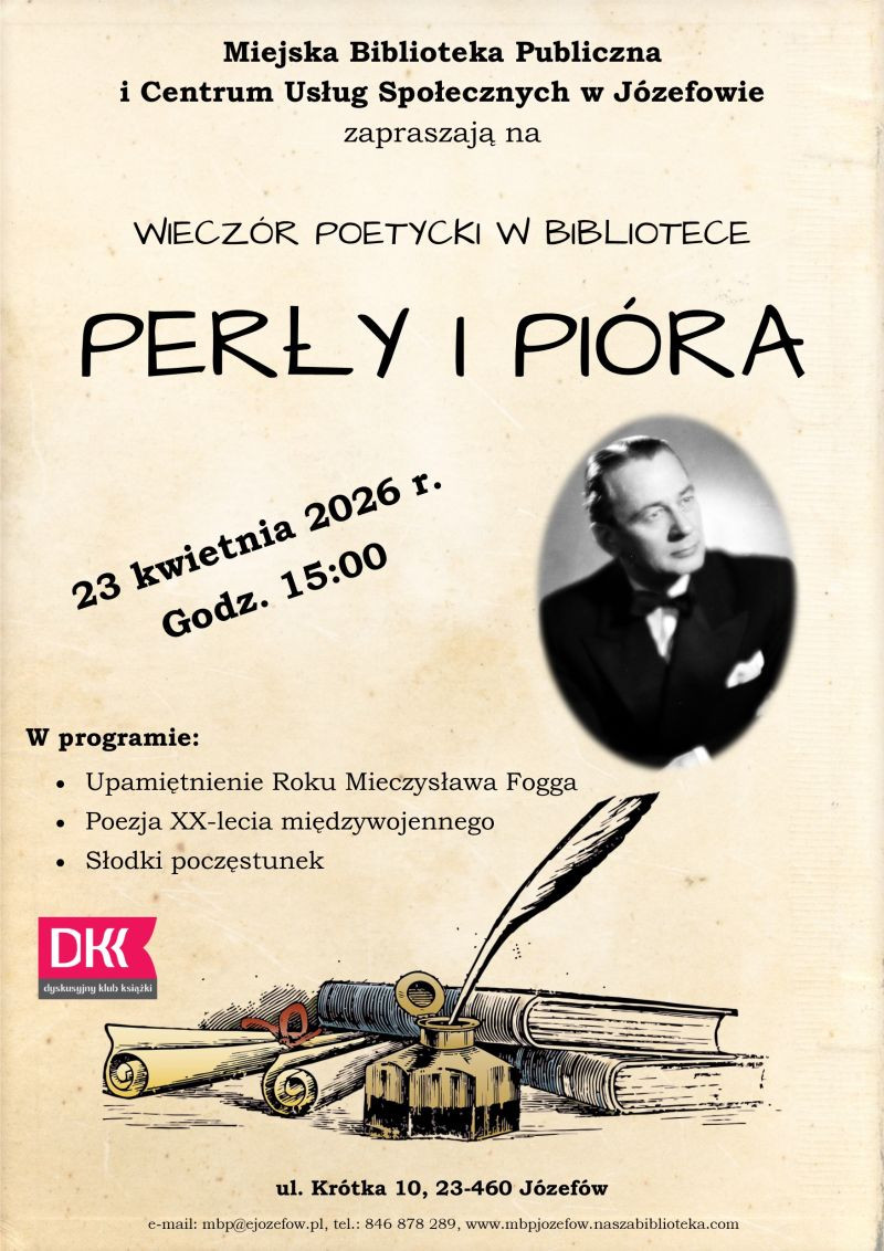 Na wieczór poetycko-muzyczny z piosenkami Mieczysława Fogga zapraszają Miejska Biblioteka Publiczna i Centrum Usług Społecznych w Józefowie. Spotkanie odbędzie się w józefowskiej bibliotece w czwartek 23 kwietnia 2026 roku i wpisuje się w obchody roku jubileuszowego artysty z okazji 125. rocznicy jego urodzin.