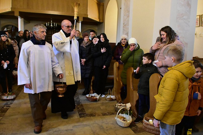 W kościołach, kaplicach, przy przydrożnych krzyżach i figurach. Wierni biorą udział w obrzędzie święcenia pokarmów.
