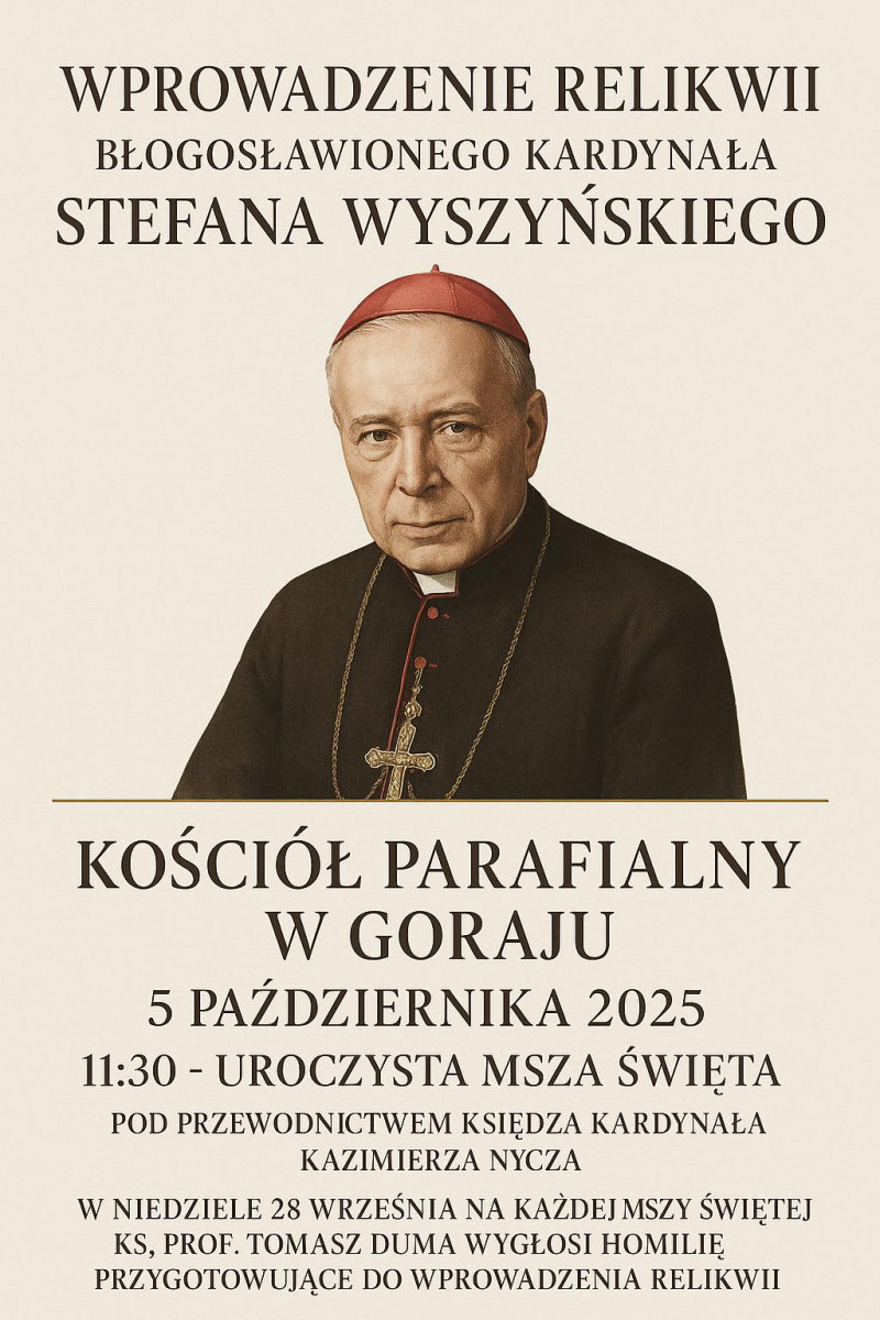 25 października 2025 roku, w Goraju odbędzie się wprowadzenie relikwii bł. Stefana Kardynała Wyszyńskiego, Prymasa Polski. Początek religijnych uroczystości o godzinie 11:30.