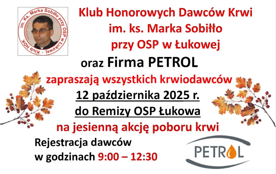 Zapraszamy na jesienną akcję poboru krwi w Łukowej. 12 października 2025 roku, początek o godzinie 9:00.