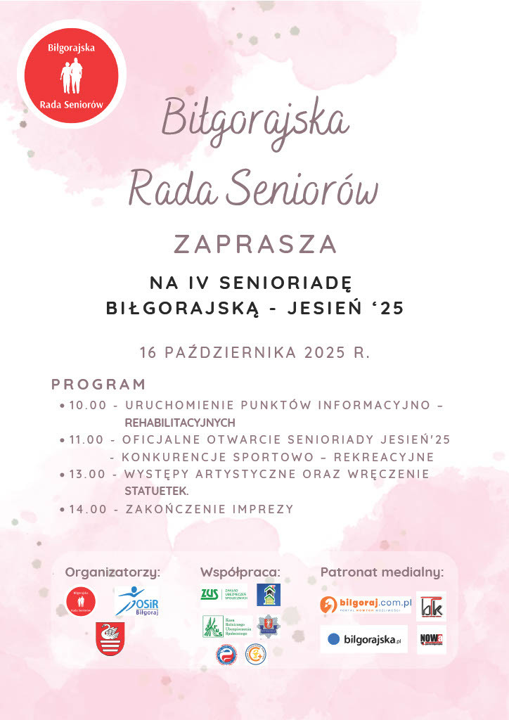 Biłgorajska Rada Seniorów serdecznie zaprasza już po raz czwarty na - SENIORIADĘ BIŁGORAJSKĄ - Jesień '25 , która odbędzie się 16 października 2025 roku, w hali Ośrodka Sportu i Rekreacji w Biłgoraju o godzinie 10:00