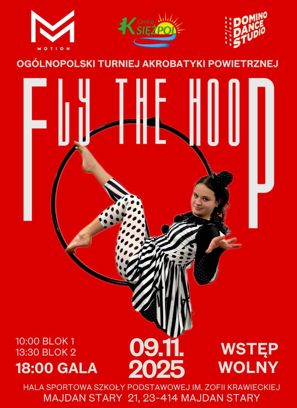 Już w najbliższą niedzielę, 9 listopada, w hali sportowej Szkoły Podstawowej im. Zofii Krawieckiej w Majdanie Starym, odbędzie się Ogólnopolski Turniej Akrobatyki Powietrznej Fly The Hoop. W turnieju weźmie udział ponad 100 uczestników z całej Polski! Widzowie będą mogli podziwiać niezwykłe występy na kole cyrkowym i chuście wertykalnej.
