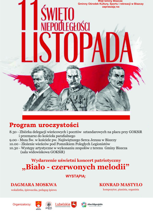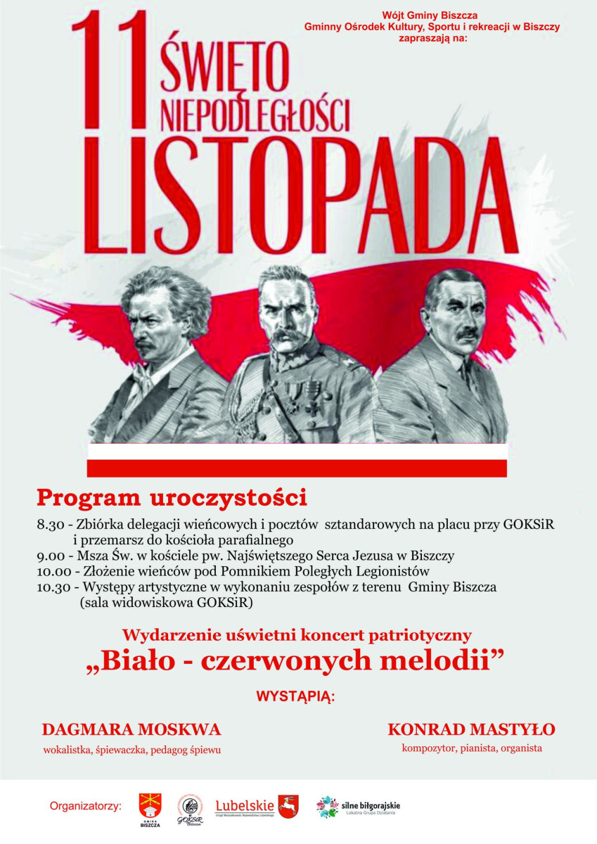 11 listopada 2025 roku, gmina Biszcza zaprasza na obchody Narodowego Dnia Niepodległości. Zbiórka uczestników o godzinie 8:30 przy GOKSiR.