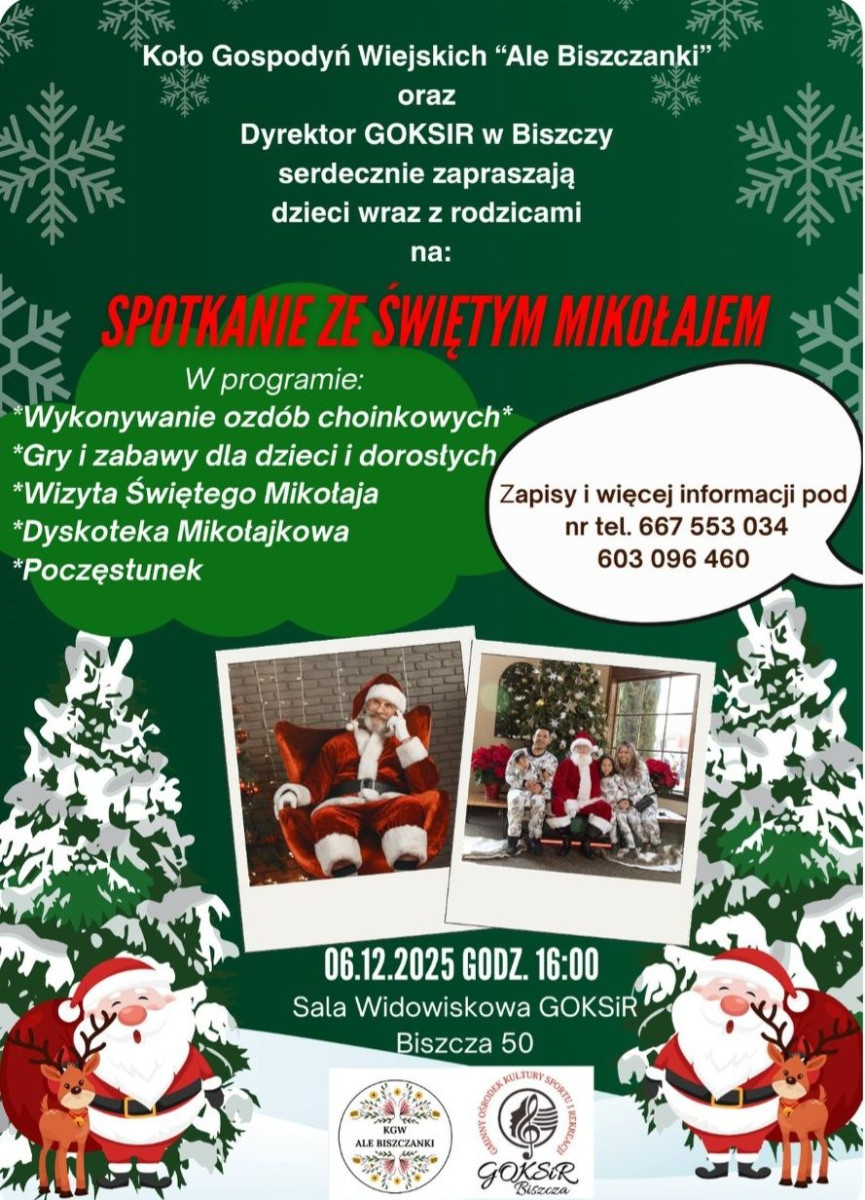 Renifery Świętego Mikołaja przygotowane do drogi, już tupią raciczkami. KGW "Ale Biszczanki" we współpracy z GOKSiR w Biszczy zapraszają wszystkie dzieci wraz z rodzicami na radosne spotkanie ze Świętym Mikołajem w dniu 06.12. 2025 r.