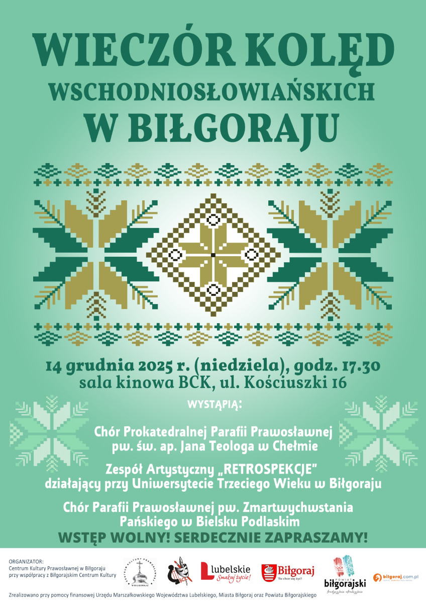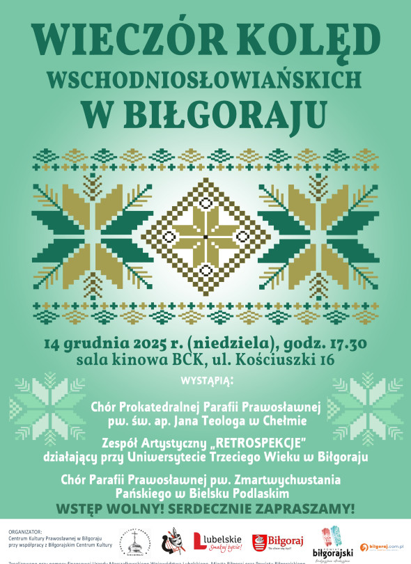 Zapraszamy na 14 grudnia 2025 roku, na godzinę 17:30 do sali widowiskowej BCK na koncert kolęd wschodniosłowiańskich.