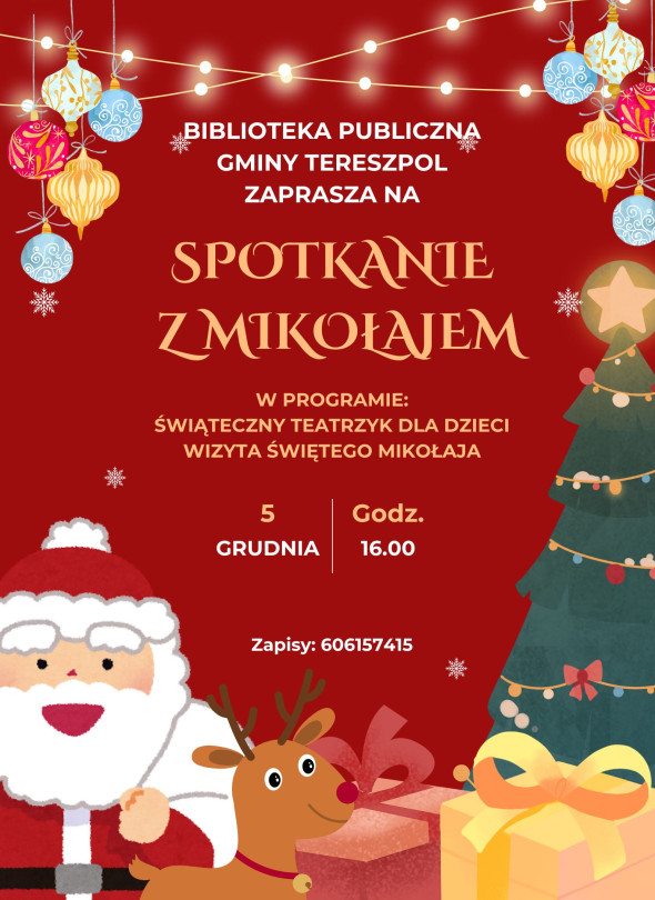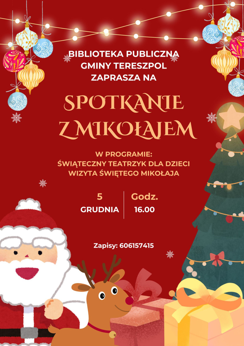 5 grudnia o godz. 16.00 zapraszamy wszystkie dzieci do Biblioteki Publicznej Gminy Tereszpol na spektakl świąteczny. Tego dnia odbędzie się spotkanie ze Świętym Mikołajem.