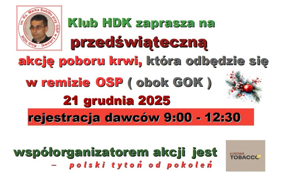 Klub Honorowych Dawców Krwi w Łukowej zaprasza na terenową, świąteczną akcję poboru krwi, która odbędzie się 21 grudnia 2025 roku. Krew oddać będzie można w godzinach od 9:00 do 12:30.