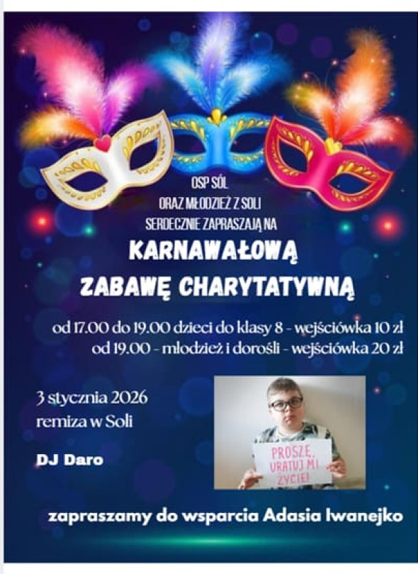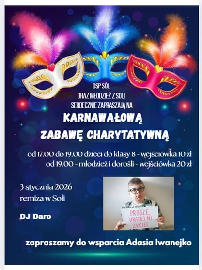 3 stycznia 2026 roku odbędzie się charytatywna zabawa karnawałowa. Zebrane środki przeznaczone zostaną na leczenie Adasia Iwanejko. Zabawa odbędzie się w dwóch turach o godziny 17:00 dla dzieci, a od godziny 19:00 dla młodzieży i dorosłych.