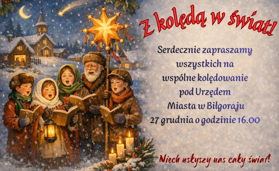 Spotykamy się o godzinie 16:00 pod choinką przy Urzędzie Miasta w Biłgoraju, by wspólnie kolędować, dzielić się radością i świątecznym ciepłem z innymi