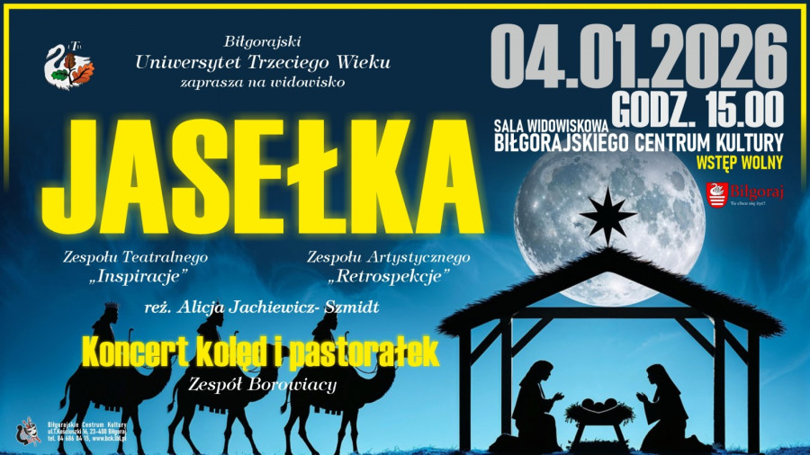 Uniwersytet Trzeciego Wieku zaprasza mieszkańców na pełne świątecznego klimatu wydarzenie, podczas spotkania publiczność obejrzy widowisko „Jasełka”, przygotowane przez zespół teatralny "Inspiracje" oraz zespół artystyczny „Retrospekcje”. Reżyserią przedstawienia zajęła się Alicja Jachiewicz-Szmidt.
