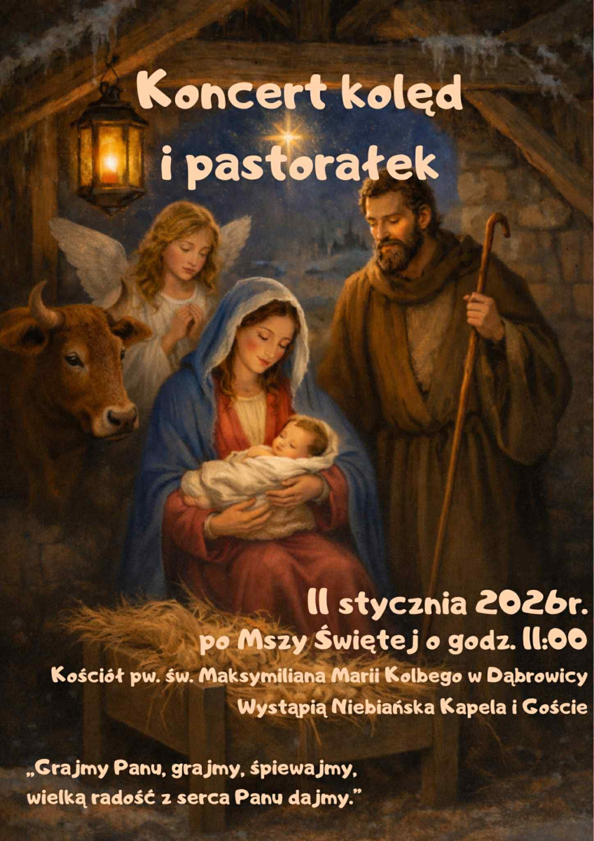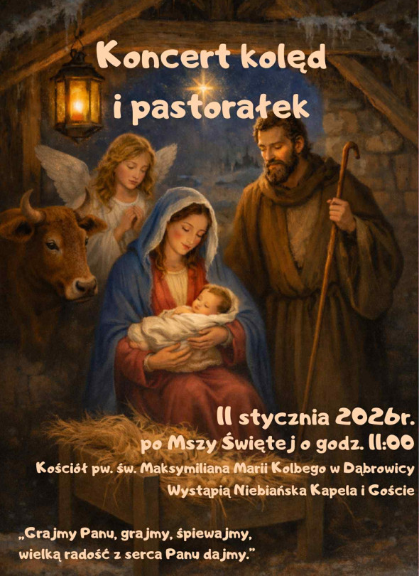 Koncert Kolęd w kościele parafialnym w Dąbrowicy, 11 stycznia 2026 roku, po Mszy Św. o godz. 11.00, czyli około godziny 12:00.