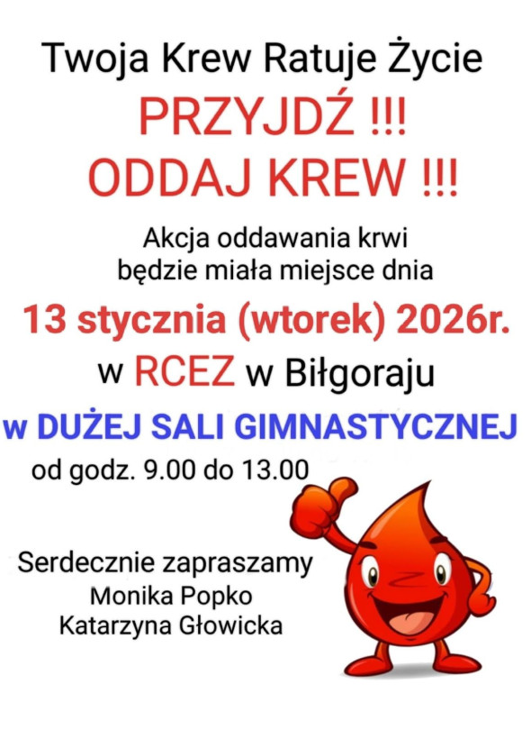 Terenowa akcja poboru krwi odbędzie się 13 stycznia 2026 roku w Regionalnym Centrum Edukacji Zawodowej w Biłgoraju,