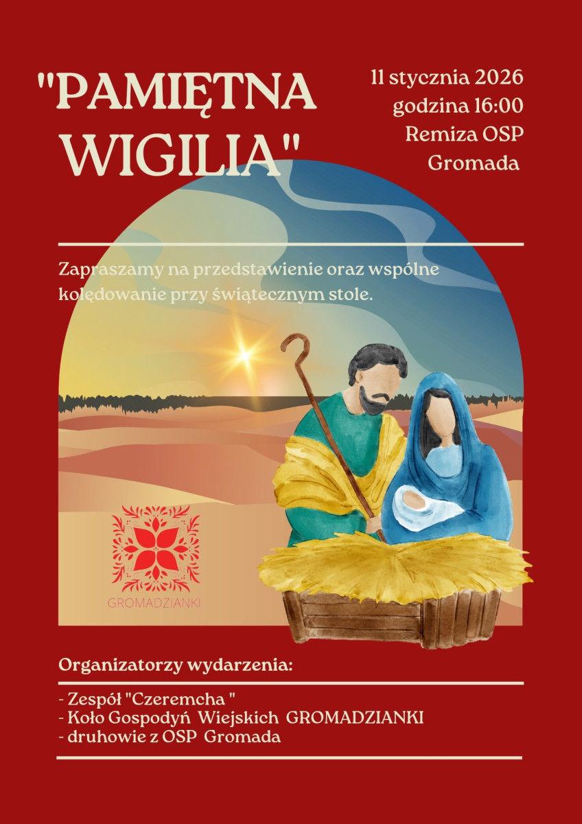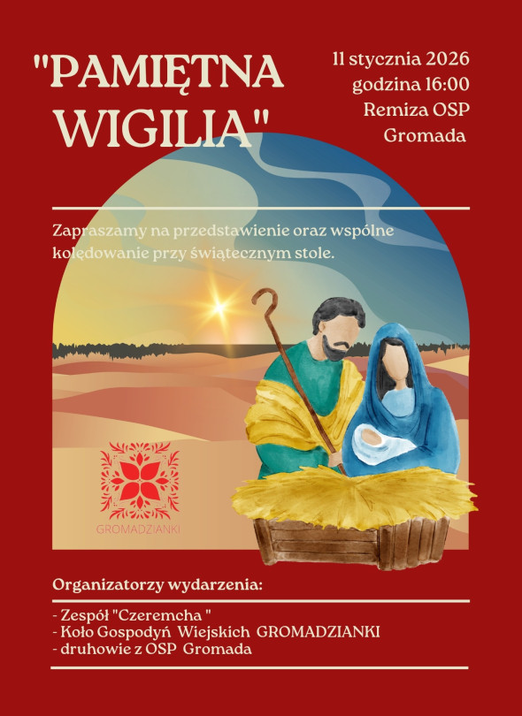 Zapraszamy Was na wyjątkowe przedstawienie pt. „Pamiętna Wigilia”, które odbędzie się 11 stycznia o godzinie 16:00 w remizie OSP Gromada.