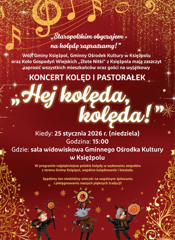 25 stycznia 2026 roku, w Gminnym Ośrodku Kultury w Księżpolu odbędzie się wieczór kolęd. Początek o godzinie 15:00.