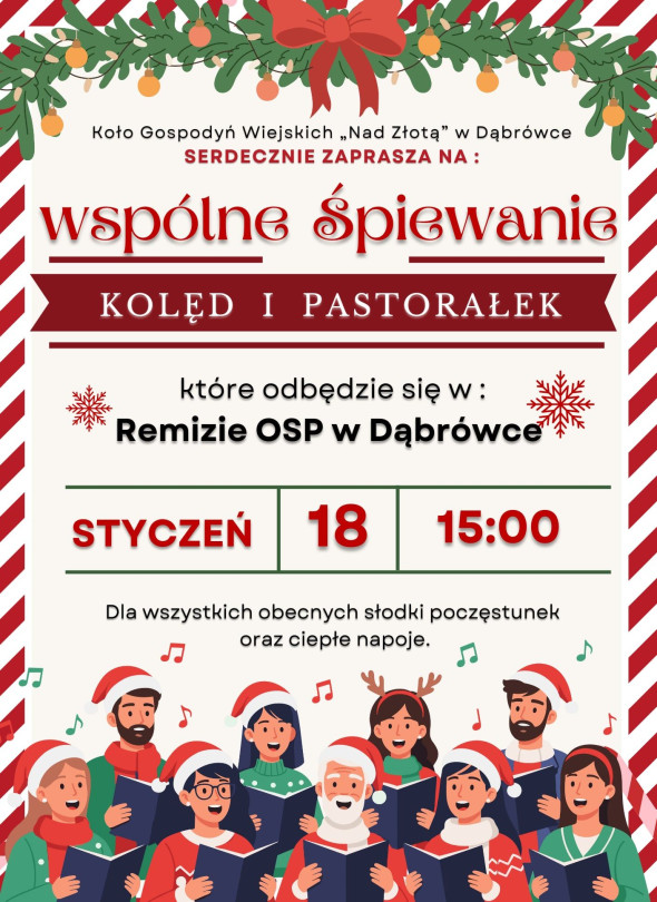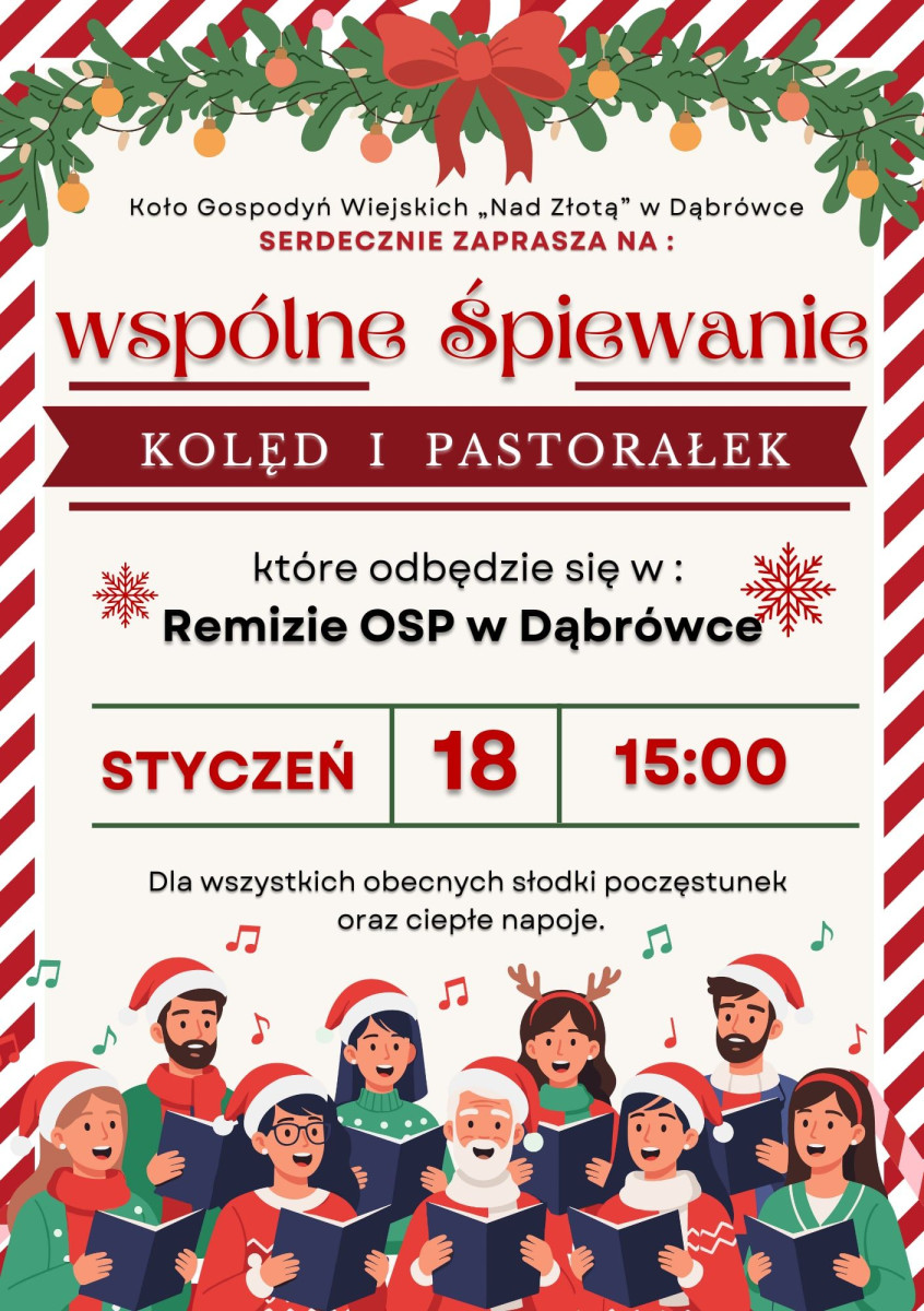 18 stycznia 2026 roku w remizie OSP w Dąbrówce rozpocznie się wspólne kolędowanie. Początek o godzinie 15:00.