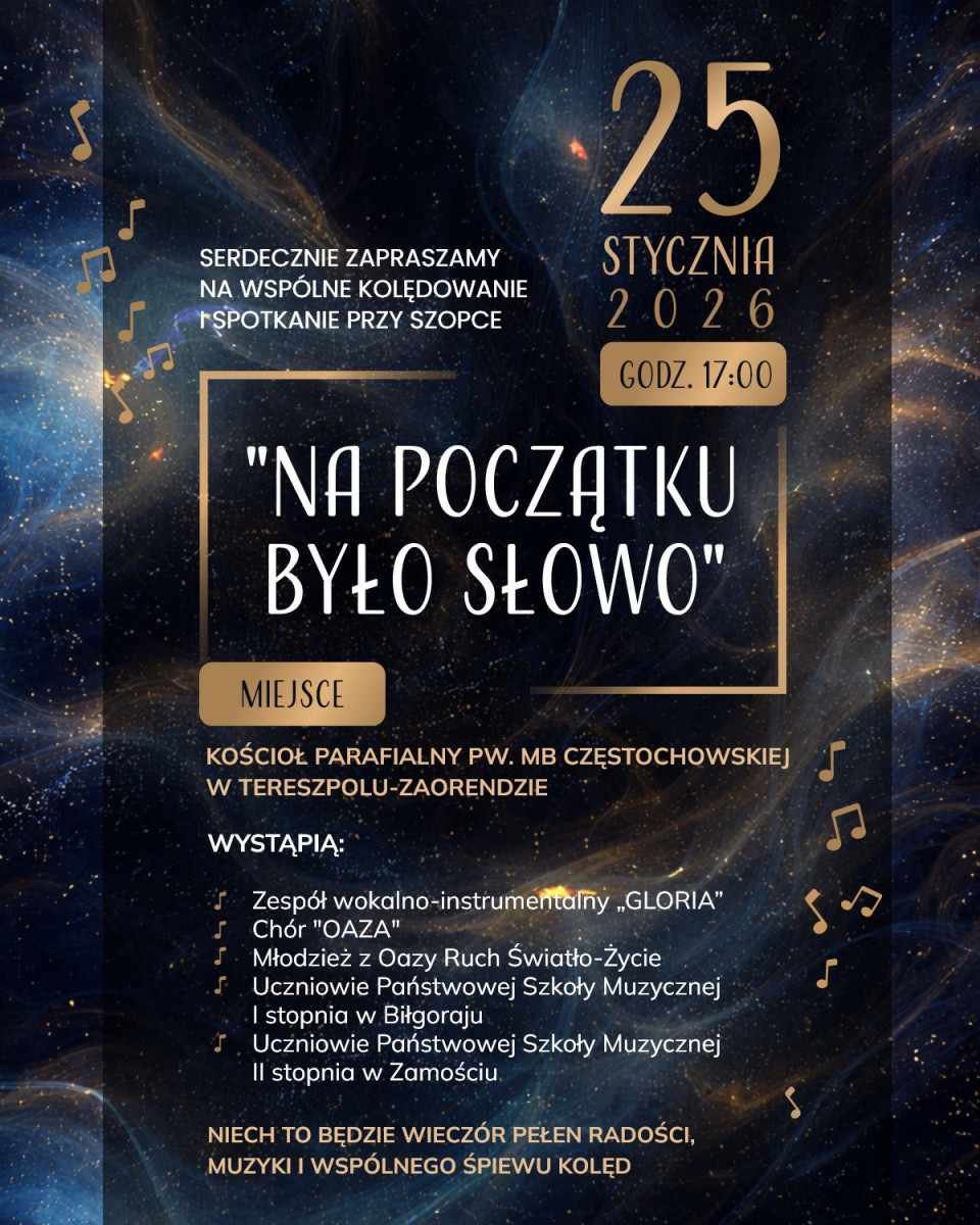 Zaproszenie na Koncert Kolęd do Tereszpola 25 stycznia 2026 roku, kościół parafialny pw. MB Częstochowskiej w Tereszpolu-Zaorendzie. Początek o godzinie 17:00.