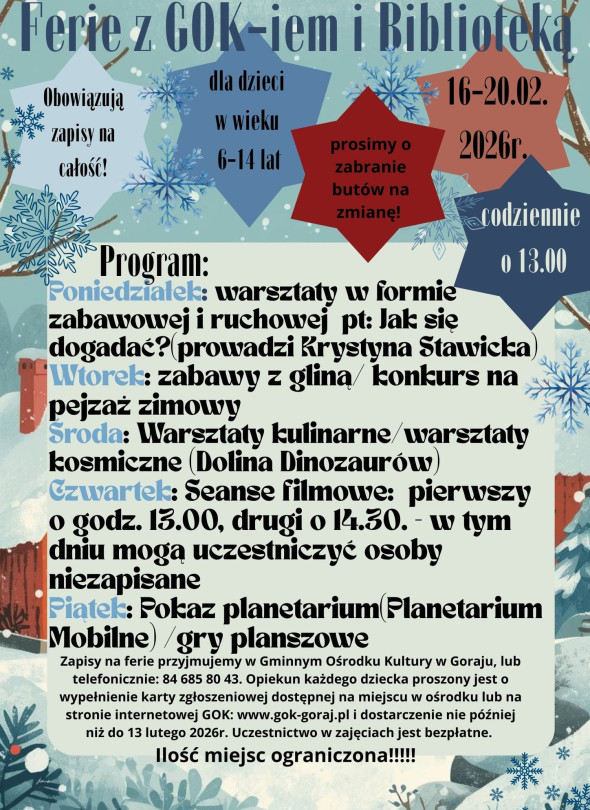 Gminny Ośrodek Kultury w Goraju zaprasza na ferie 2026.