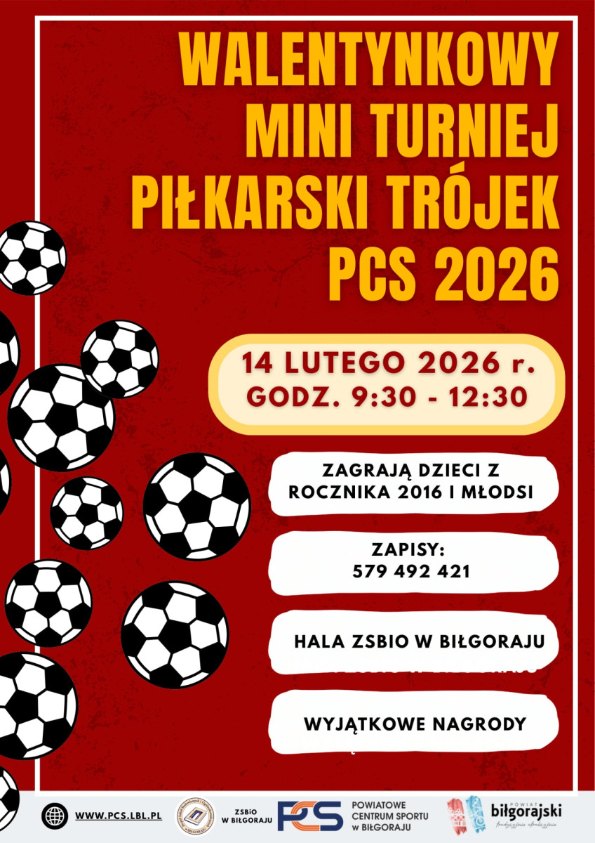 Walentynkowy mini turniej piłkarski trójek. 14 luty 2026 roku, godzina 9:30, hala sportowa ZSBiO w Biłgoraju.