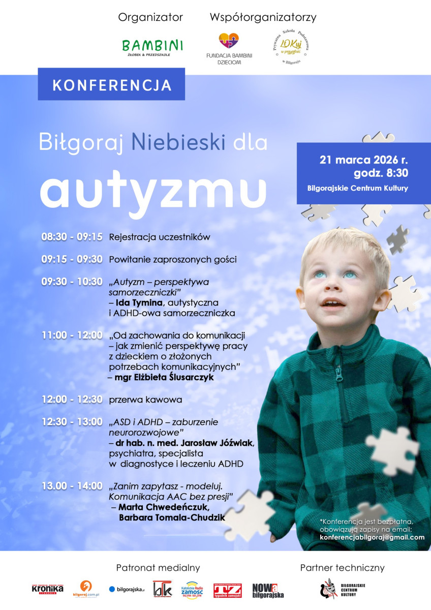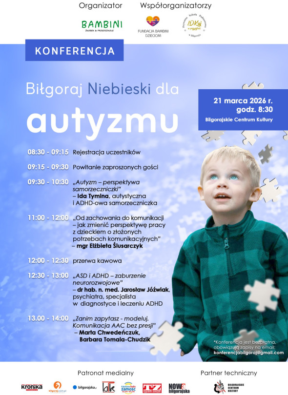 Konferencja Biłgoraj niebieski dla autyzmu, 21 marca 2026 roku, sala widowiskowa BCK, godzin 8:30.