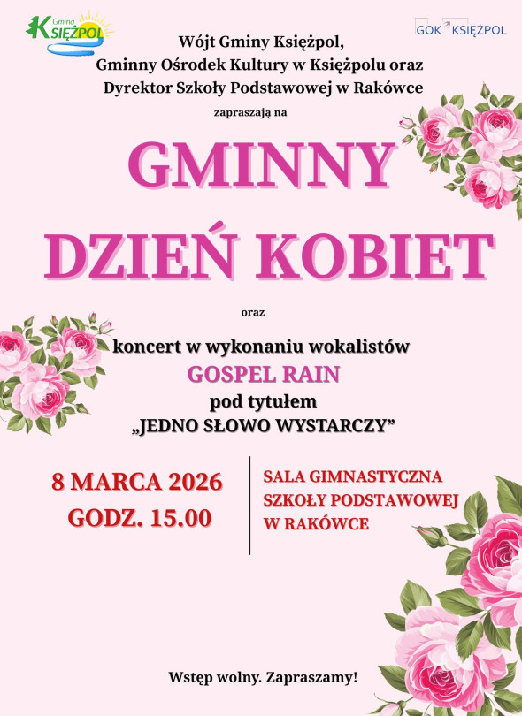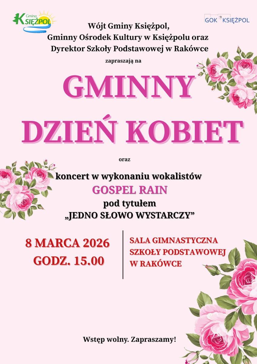 Gmina Księżpol zaprasza na Gminny Dzień Kobiet. Wydarzenie odbędzie się 8 marca 2026 roku, w sali sportowej Szkoły Podstawowej w Rakówce. Początek o godzinie 15:00.