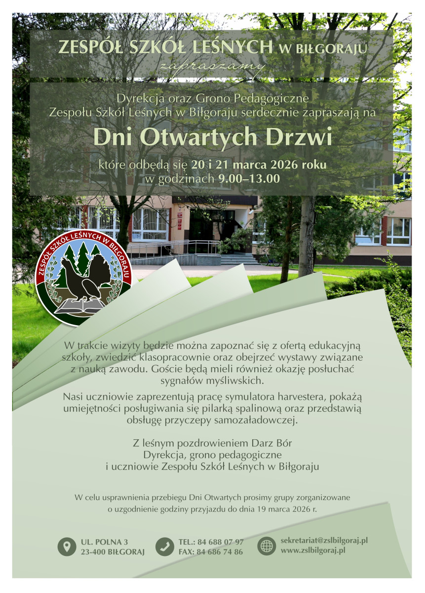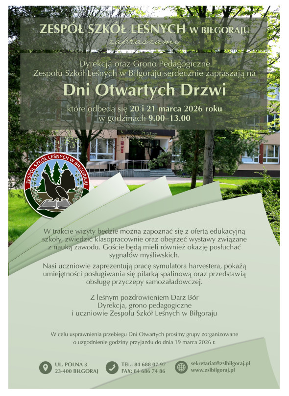 W dniach 20 i 21 marca 2026 roku, odbędą się dni otwarte w Zespole Szkół Leśnych w Biłgoraju. Start o godzinie 9:00.