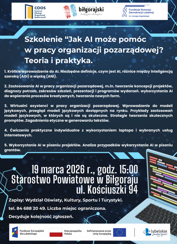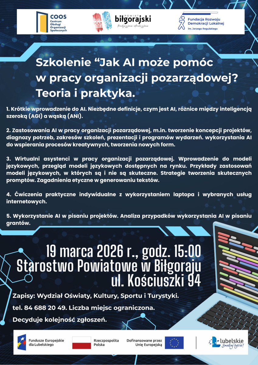 19 marca 2026 roku, w sali konferencyjnej Starostwa Powiatowego w Biłgoraju odbędzie się konferencja poświęcona wykorzystaniu AI w działalności organizacji pozarządowych. Początek o godzinie 15:00.