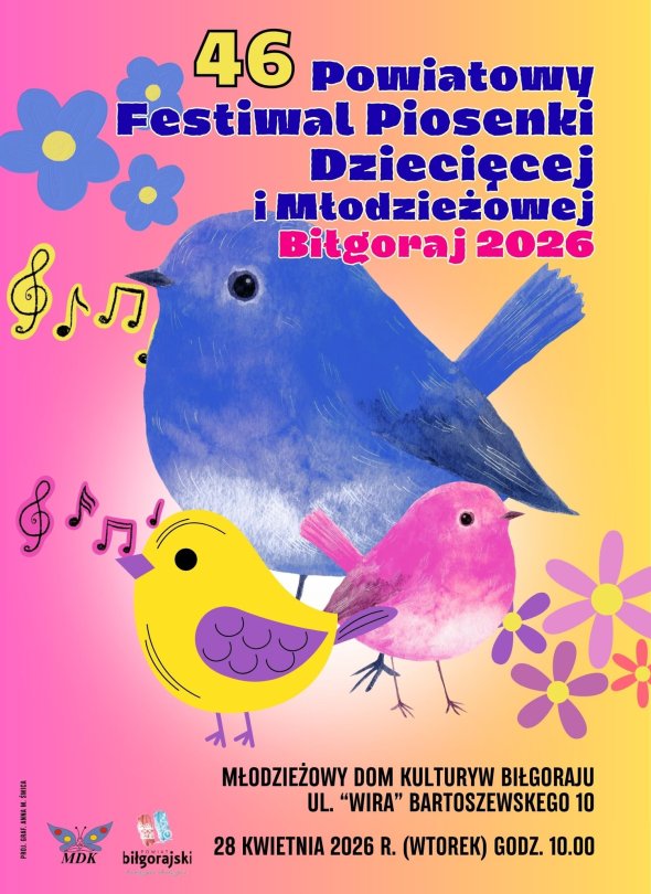 28 kwietnia 2026 roku, w Młodzieżowym Domu Kultury odbędzie się 46. Powiatowy Festiwal Piosenki Dziecięcej i Młodzieżowej. Początek o godzinie 10:00.