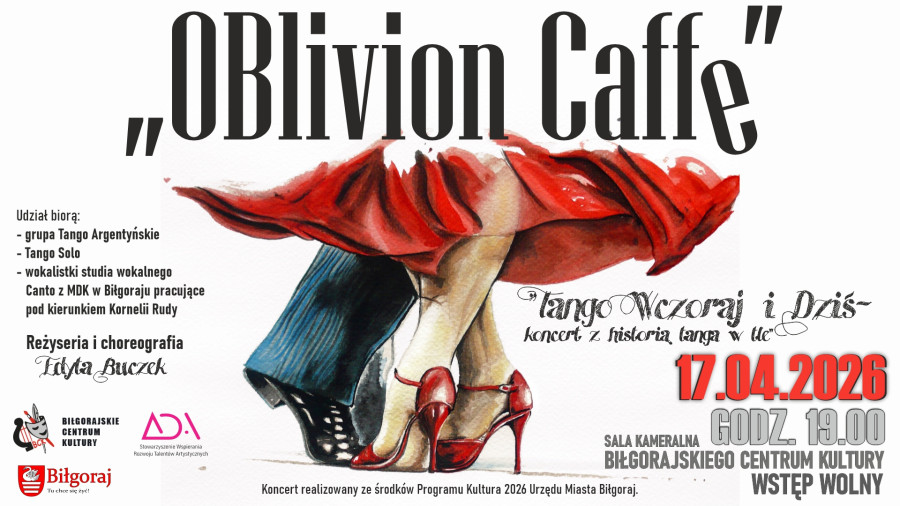 Koncert „Oblivion Caffe - Tango wczoraj i dziś” odbędzie się 17 kwietnia 2026 roku o godzinie 19:00 w sali kameralnej Biłgorajskiego Centrum Kultury.