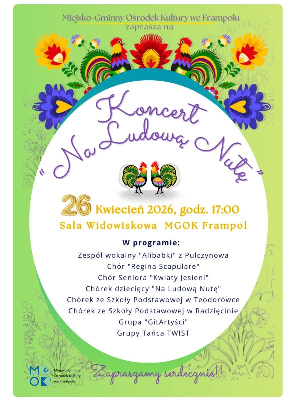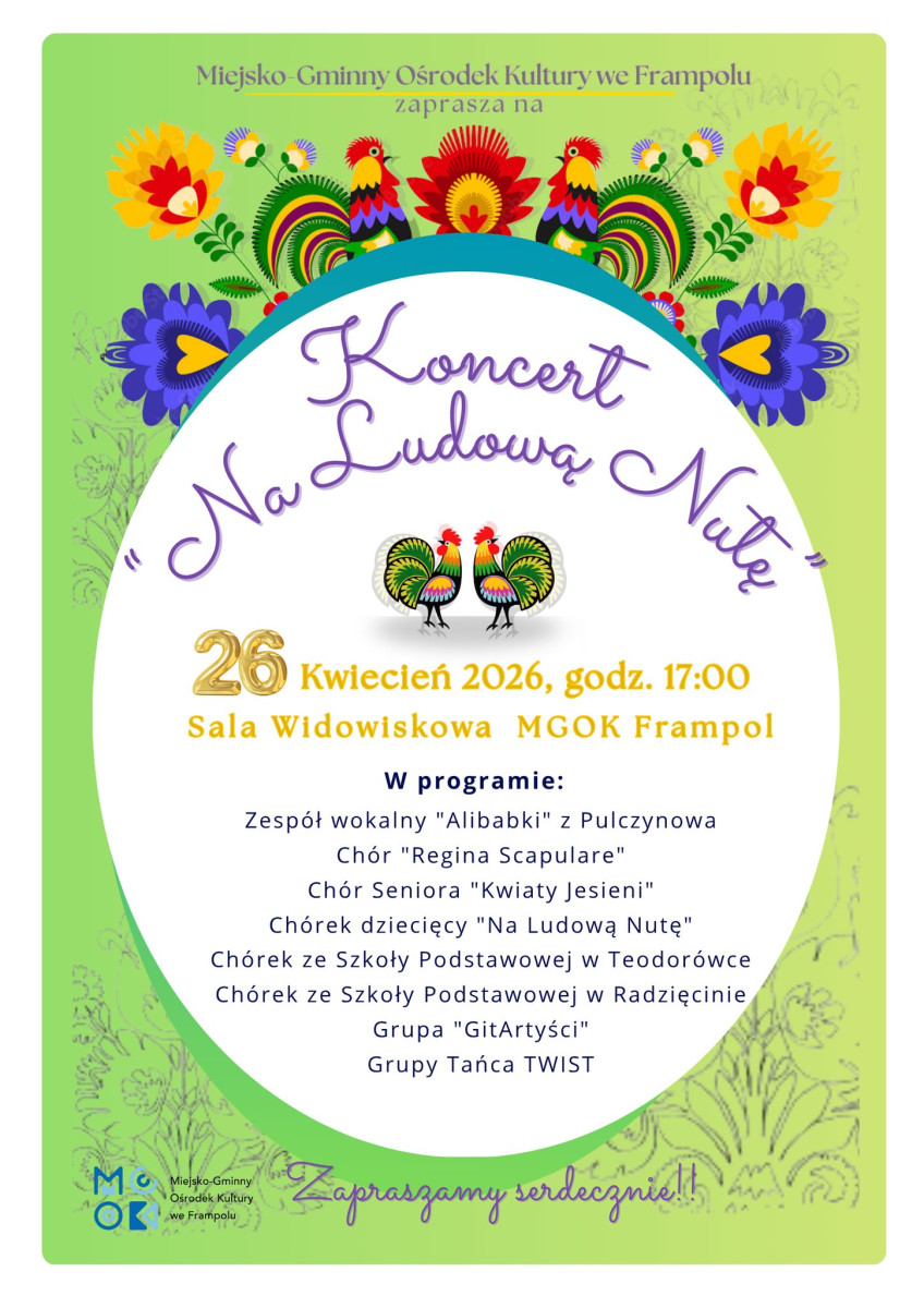 26 kwietnia 2026 roku, w sali widowiskowej Miejsko - Gminnego Ośrodka Kultury we Frampolu odbędzie się koncert "Na ludową nutę". Początek o godzinie 17:00.