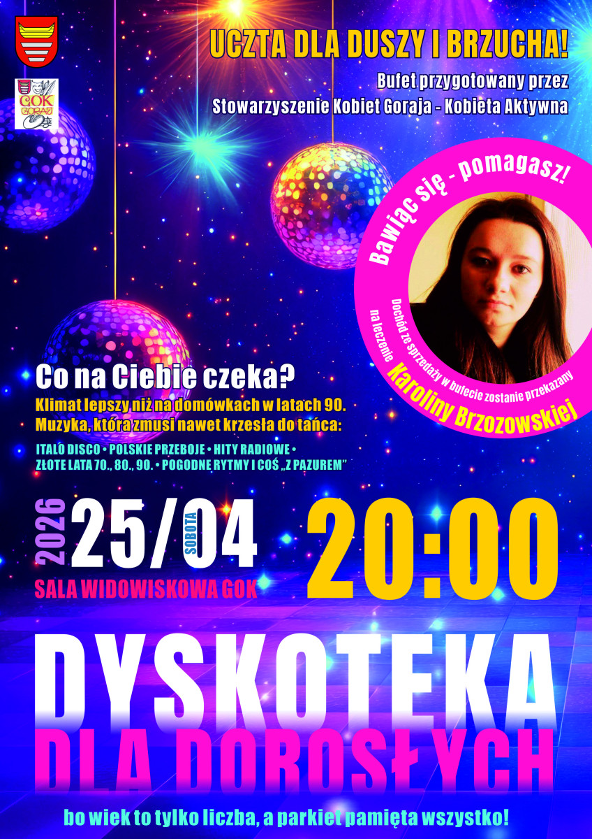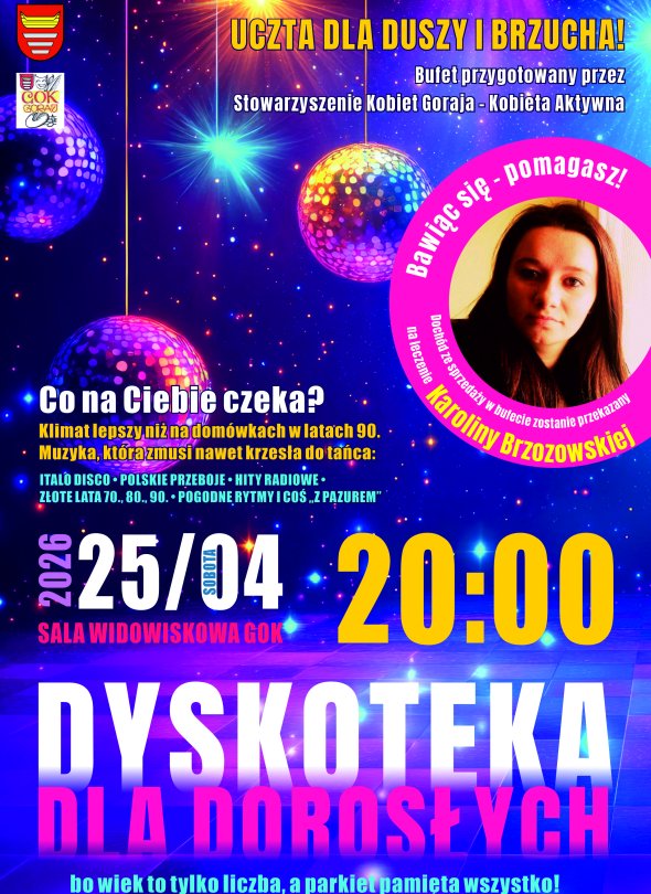 Dyskoteka dla dorosłych w GOK Goraj. 25 kwietnia 2026 roku, godzina 20:00.
