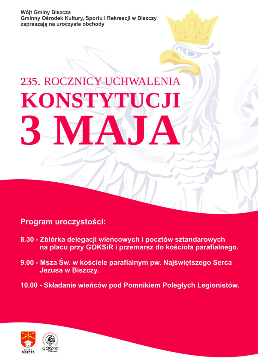 Gmina Biszcza zaprasza na uroczystości 3 Maja. Początek o godzinie 8:30.