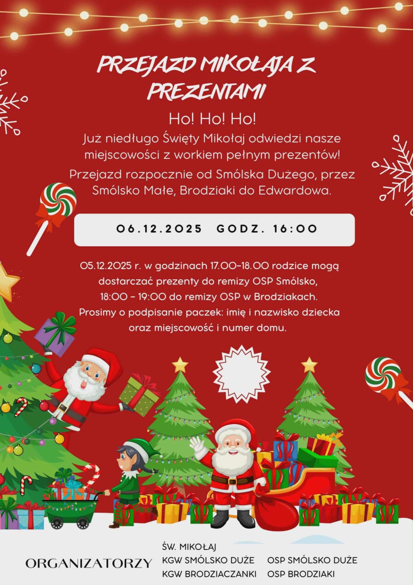 5 grudnia w godz. 18:00 - 19:00 zapraszamy mieszkańców Brodziaków i Edwardowa do Remizy OSP w Brodzikach, gdzie będzie można dostarczyć podpisane prezenty (imię, nazwisko dziecka, miejscowość i numer domu).