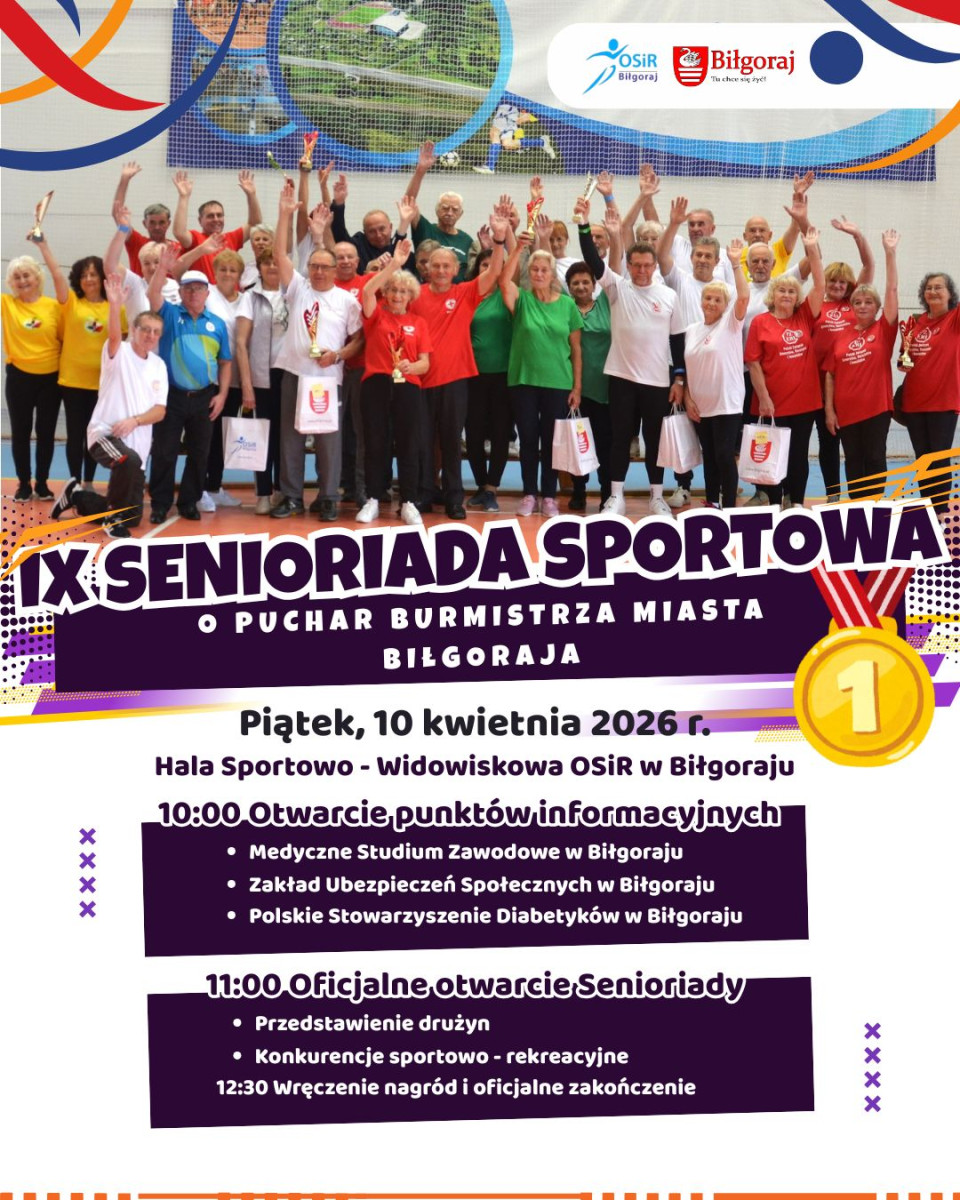 W piątek, 10 kwietnia 2026 roku, obiekty Ośrodka Sportu i Rekreacji w Biłgoraju wypełnią się energią, uśmiechem i duchem sportowej rywalizacji. Zapraszamy na 9. Senioriadę Sportową o Puchar Burmistrza Miasta Biłgoraja – wydarzenie, które udowadnia, że pasja do ruchu nie zna wieku!