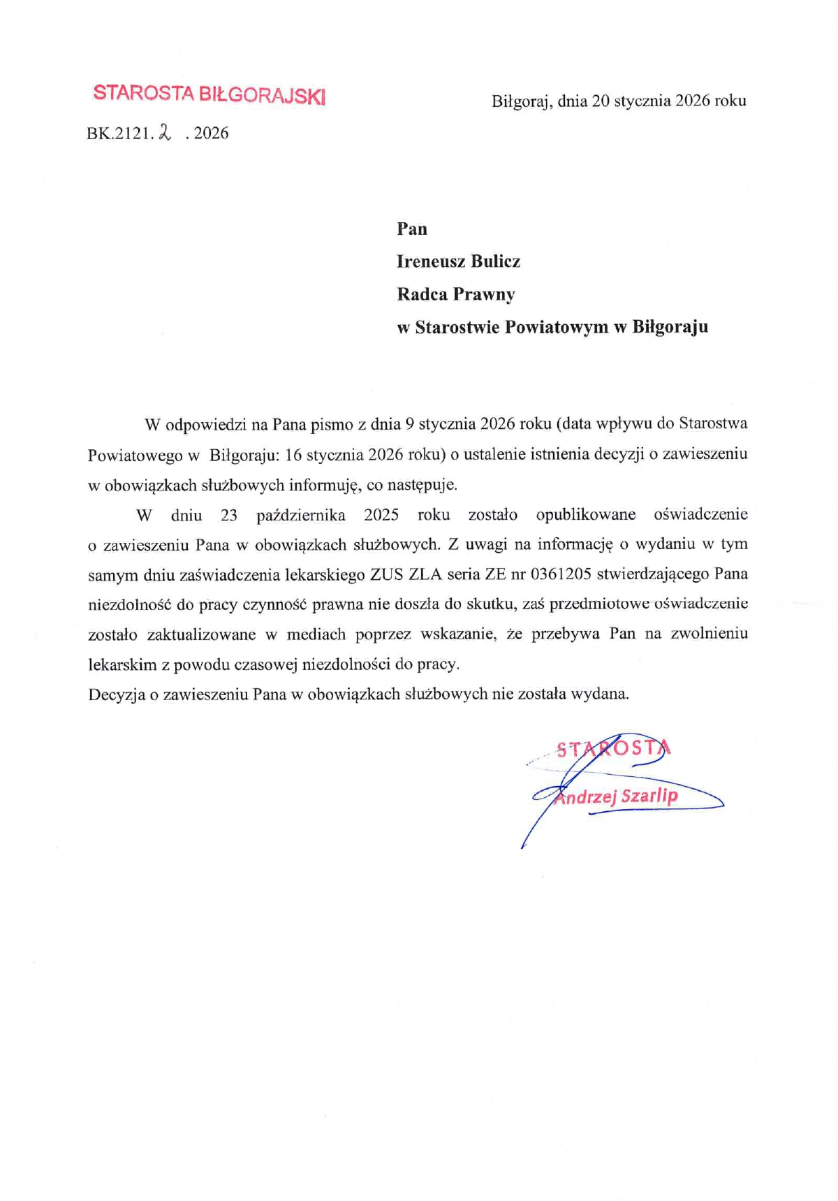 W nawiązaniu do wcześniejszych publikacji dotyczących rzekomego zawieszenia w obowiązkach służbowych Pana Ireneusza Bulicza - radcy prawnego w Starostwie Powiatowym w Biłgoraju - redakcja informuje, że decyzja o zawieszeniu Pana Ireneusza Bulicza nie została wydana, co zostało potwierdzone w piśmie Starosty Biłgorajskiego z dnia 20 stycznia 2026 r.