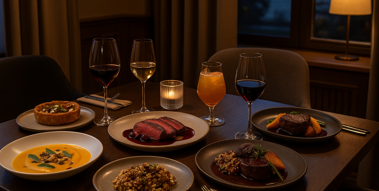Jesienna karta zachęca, by wybrać menu degustacyjne: sekwencję pięciu lub siedmiu dań, które układają się w spójną opowieść o sezonie. Każdy kurs to inne tempo i inna faktura — od chrupkości kiszonej gruszki, przez aksamit dyni, po umamiczny ciężar grzybów. Obsługa dba o płynność serwisu i subtelne wprowadzenie do każdego talerza, zwracając uwagę na szczegóły: temperaturę, czas podania, idealny moment na wino. Dodatkowym atutem jest przemyślany wystrój: miękkie tkaniny, naturalne drewno, szkło, które pięknie łapie jesienne światło. To idealna sceneria na rocznicę, spotkanie biznesowe albo po prostu wieczór, który ma smakować lepiej niż zwykle.