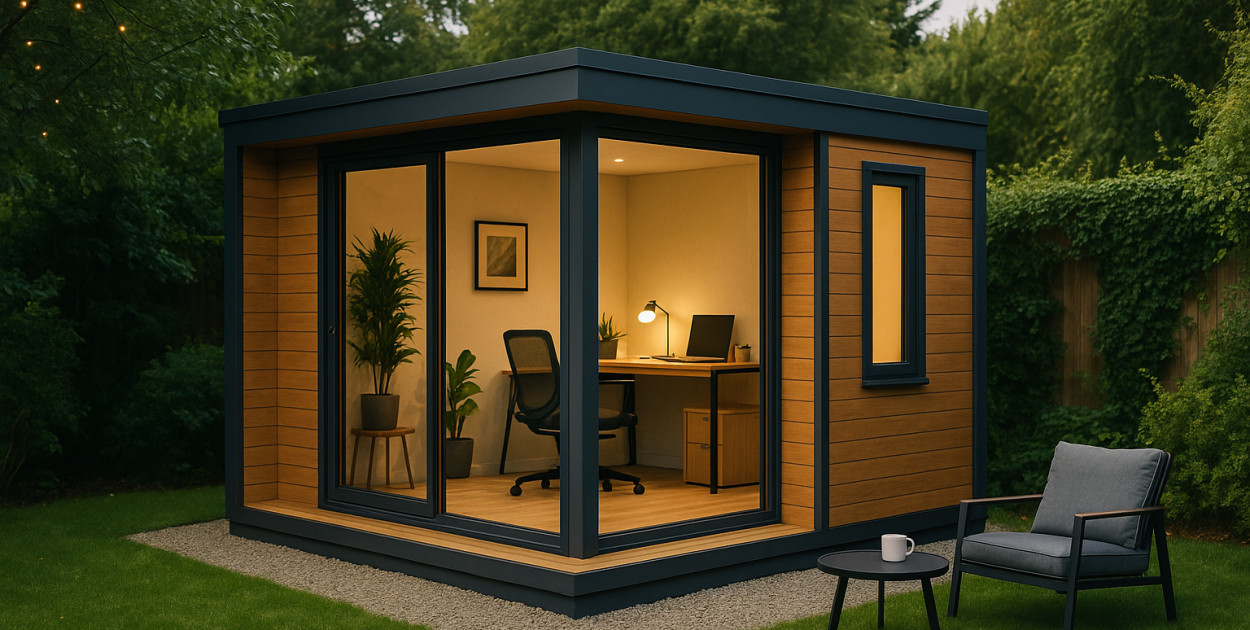 Taki moduł może mieć osobne wejście, duże okno na zieleń, kompaktową łazienkę i aneks kuchenny na kawę. W środku jest miejsce na biurko, regały, wygodny fotel i wszystko, co potrzebne do skupienia. Rano wychodzisz z domu jak do pracy, ale bez korków i komunikacji miejskiej. Po południu zamykasz laptop i dosłownie wracasz do domu, zostawiając zawodowe sprawy po drugiej stronie ogrodu.