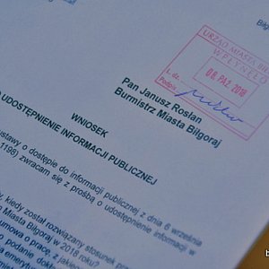 Kandydat złożył także w biurze podawczym Urzędu Miasta Biłgoraj, w trybie dostępu do informacji publicznej pytania do Burmistrza Janusza Rosłana. -Proszę o odpowiedź w ciągu trzech dni, tak aby Mieszkańcy Biłgoraja zostali poinformowani ile kosztowało ich przejście na emeryturę wiceburmistrza Deca. Czy prawdą jest, że wiceburmistrz Dec otrzymał odprawę w wysokości sześciu pensji, czyli kwotę w przedziale 40 - 50 tys. zł, czy wyższą? Czy prawdą jest, że za chwilę otrzyma pan wiceburmistrz Dec kolejną odprawę na zakończenie kadencji? W jakiej wysokości? Czy chodzi o trzymiesięczne wynagrodzenie? - mówił przed biłgorajskim ratuszem Szeliga.