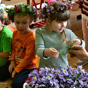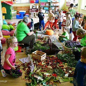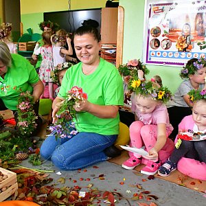 W ruch poszły liście, gałązki krzewów, kwiaty, orzechy, kasztany, żołędzie, kolorowe wstążki, a przede wszystkim dziecięcy zapał, kreatywność i manualne zdolności. Przedszkoli przy pomocy instruktorem z Faktorii Natury i pan wychowawczyń przygotowały nie tylko piękne i okazałe wianki ale i unikalne, niepowtarzalne, kolorowe, jesienne stroiki, które zdobić będą stoły ich domów.