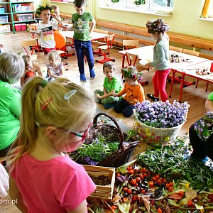 Dzieci miały okazję poznać skarby jesieni, dowiedzieć się jak i dlaczego żółkną liście, jak wykonuje się wianek i co on symbolizuje, skąd biorą się orzechy i żołędzie, co zrobić można z kasztanów i kolorowych traw.